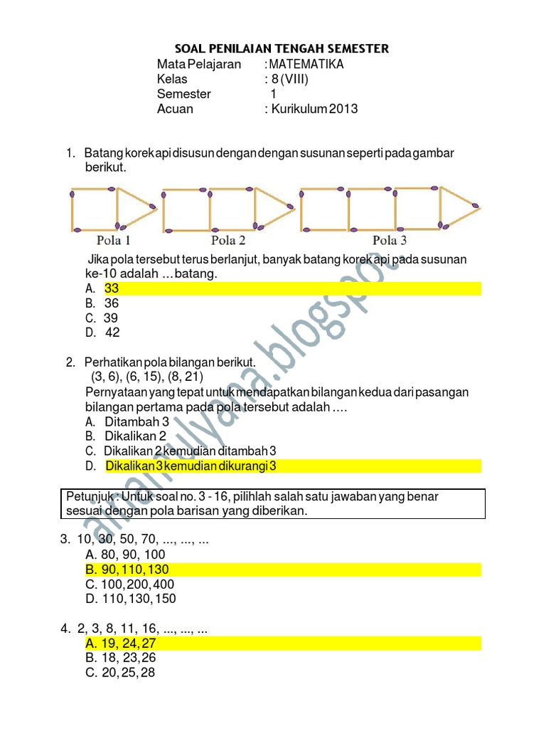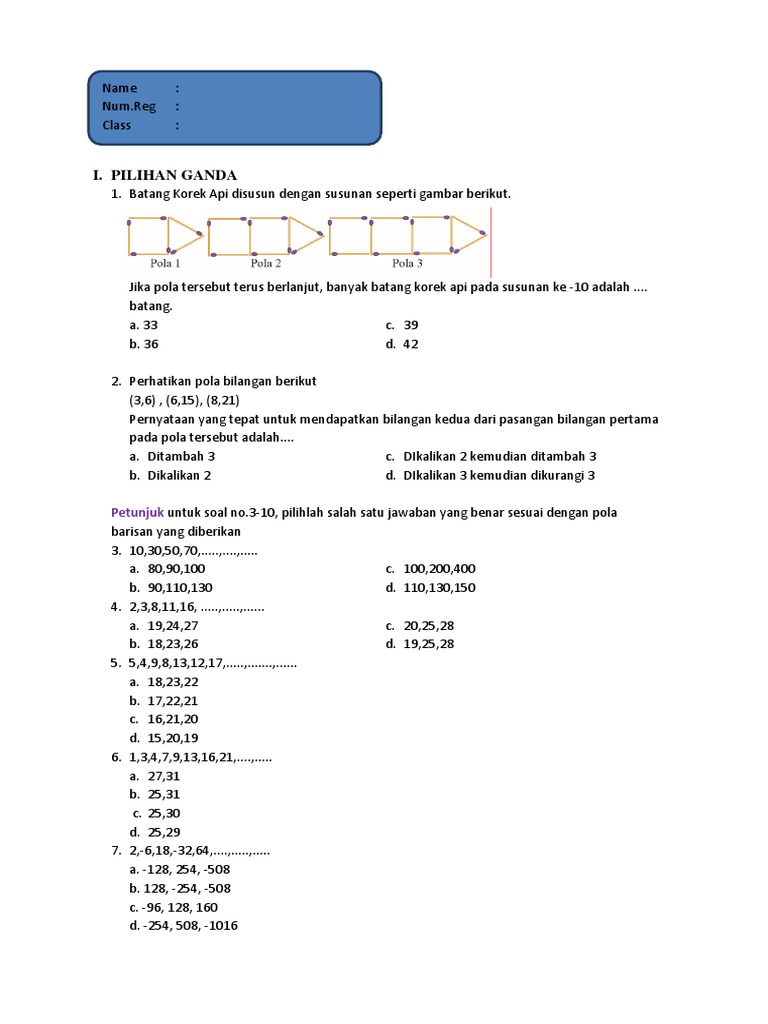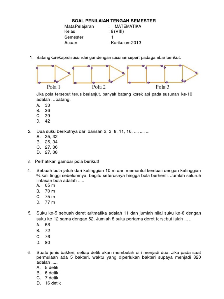 Barisan aritmatika adalah barisan yang memiliki selisih atau beda yang dari pola yang terbentuk dimana selisih antara pola yang berdekatan selalu konstan yakni berselisih 3 batang korek api , maka bisa disimpulkan ini. 1 batang korek api disusun dengan dengan susunan seperti pada gambar berikut. Batang korek api disusun dengan dengan pada gambar kompetens 4. Bentuk pertanyaan jika pola tersebut terus berlanjut, maka banyak batang korek api pada. Catatan tentukan terlebihdahulu rumus suku = nya! Uji kompetensi 1 matematika kelas 8 hal 34 a. Jadi jalur kereta api pertama di priangan bukanlah jalur yang kita kenal selama ini, yaitu jalur batavia, purwakarta, cikampek sampai ke bandung. Jika n pada bilangan 1.248n adalah suatu bilangan bulat positif, nilai n agar angka satuannya 8 adalah. Bentuk pertanyaan jika pola tersebut terus berlanjut, maka banyak batang korek api pada. Batang korek api disusun dengan dengan susunan seperti pada gambar berikut. Batang korek api disusun dengan dengan susunan seperti pada gambar berikut. Usia seorang ayah sekarang adalah tiga kali usia anaknya.dua belas tahun yang lalu,usia sang ayah 6 kali usia anaknya.tentukan usia mereka saat ini. Pola 1 pola 2 pola 3 jika pola tersebut terus berlanjut, banyak (3, 6), (6, 15), (8, 21) pernyataan yang tepat untuk mendapatkan bilangan kedua dari pasangan bilangan pertama pada pola tersebut adalah.